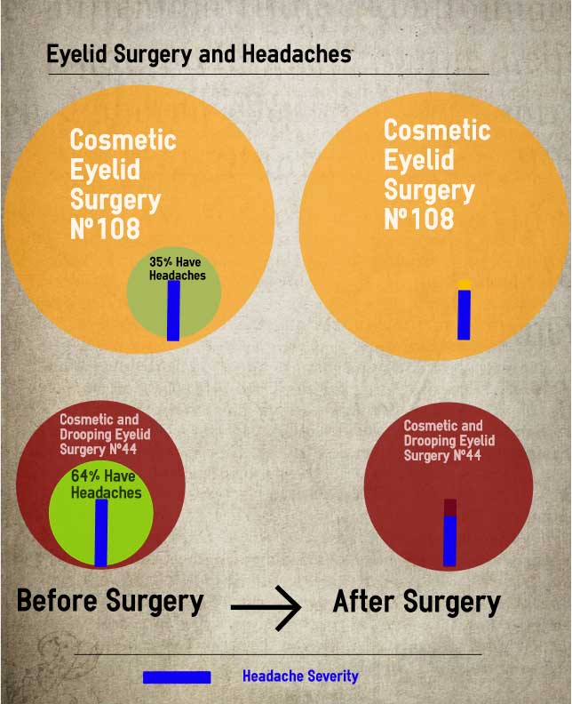 The conclusion is more patients with drooping eyelids affecting vision have headaches than patients who just want cosmetic upper eyelid surgery and though both groups have less severe headaches after surgery those whose vision was affected have more improvement. Additionally the more their vision was affected the greater headache severity they had before surgery and the more relief they had after surgery.