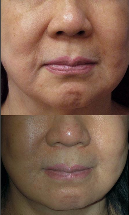 Before (top) and 5 months after (bottom) surgery photos of secondary facelift and injection fat grafting to the chin. The marionette and laugh lines were reduced by a combination of facelift and fat grafting. 5cc of fat was placed in the lower lip chin groove and 8cc was placed directly into the chin. To rejuvenate the area and reduce chin dimpling (mentalis muscle strain).