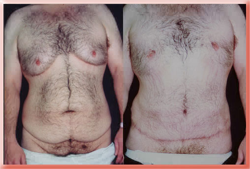 This is a 29 year old, 5’10” 220 pound individual who had lost 130 pounds by dieting. This left him with a lot of excess skin over large areas of the body. In this case I cut out the excess fat and removed a 1cm crescent of skin from the upper edge of the areola. He had an abdominoplasty – tummy tuck at the same time and I was able to pull some chest skin down towards the abdomen in the process which gave him more chest skin tightening with less chest skin scarring.