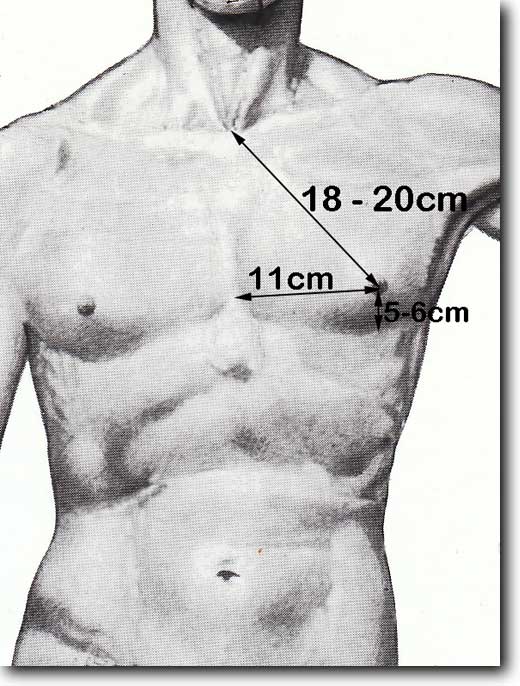 The way to assess the amount of excess skin is to take the measurements depicted above. The sternal notch to nipple distance should be 18 to 20cm, the midline to nipple distance should be 11cm, areola diameter should be 3cm and the nipple to chest abdomen junction should be 5 to 6 cm apart. Deviations from these measurements should be taken into account when planning the pattern of skin removal that needs to be removed at surgery. In most patients with extra skin the breast tissue has stretched the overlying skin, gravity pulls it downward and the treatment is simple removal of a crescent of skin above the areola. Some surgeons believe that the skin will shrink after removal of the underlying breast tissue and therefore never remove any skin. Although this may be true for patients in their early teens I do not believe that is the case for adult patients past that age. In my experience these patients are very unhappy if excess skin when present is not addressed at the same surgery.