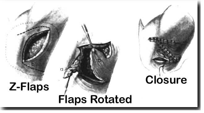 For less severe cases or those who have had surgery earlier I prefer 2 opposing V to Y advancement flaps of skin.