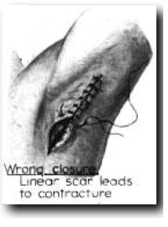 I had a patient in whom I closed an armpit excision with a flap. The end of the flap died so I took her back to the operating room to place a skin graft. In the interim she had healed by contraction. On the operating room table I stretched the healed wound with my fingers and it reopened so I could skin graft it. That scar could have torn open when she was at home reaching for something in a cupboard.