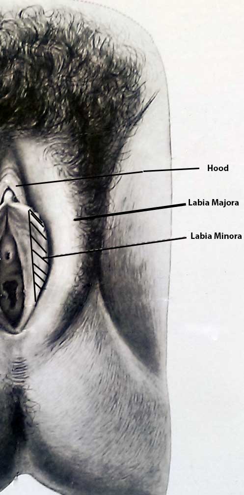 is a straightforward approach to volume reduction by cutting off the free edge of the labia minora. The surgeon puts a clamp across the edge, cuts the protruding tissue and sutures under the clamp before releasing it. The approach is quick however, the aesthetic outcome is poor. The natural color, contour, and texture are lost, the edges may evert exposing vaginal lining and the scar may be highly visible. There is a greater risk of removing too much tissue with this approach so that clitoral area looks overly prominent. An Australian review revealed that some Australian women were being pressured into more extensive surgery to the clitoral hood because doctors had removed so much of their labia that they needed to “balance” out the other areas.