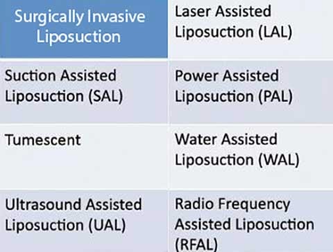Liposuction and all its variants tumescent liposuction, large volume liposuction, superficial liposuction, smartlipo, slimlipo, power assisted liposuction, microliposculpture, ultrasound assisted liposuction, superwet liposuction, xerona, Syringe-Assisted Liposuction, liposuction using a laser, water jet assisted liposuction.